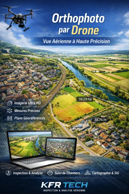 KFR Tech propose des prestations d’orthophotographie par drone pour obtenir des vues aériennes haute précision, parfaitement géoréférencées et exploitables pour l’analyse technique. Contrairement à une simple photo aérienne, l’orthophoto corrige les déformations liées à la perspective et au relief, offrant une représentation fidèle et mesurable du terrain ou de l’ouvrage.